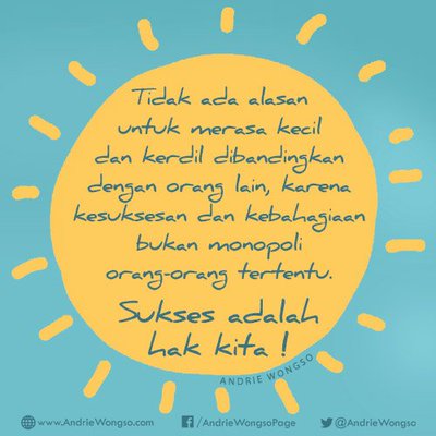 Tidak ada alasan untuk merasa kecil & kerdil dibandingkan dengan orang lain, karena kesuksesan & kebahagiaan bukan monopoli orang-orang tertentu. Sukses adalah hak kita! Perjuangkan dengan cara yang baik & benar, agar hasilnya pun penuh berkah & membanggakan.