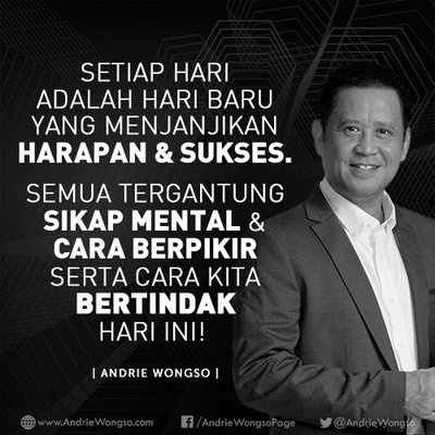 Setiap hari adalah hari baru yang menjanjikan harapan & sukses. Semua tergantung sikap mental & cara berpikir, serta cara kita bertindak hari ini! #andriewongso#successismyright#motivasi