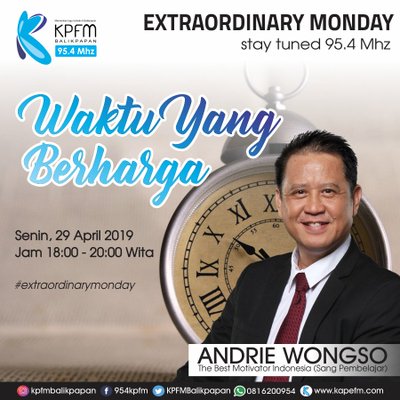 Teman2.. Simak #ExtraordinaryMonday hari ini, 29/4 di acara Golden Hits Romantic (sesi saya dimulai pukul 17.40 WIB / 18.40 WITA) di radio KPFM Balikpapan—95,4 MHz. Tema: Waktu yang Berharga; LIVE Streaming kapefm.com atau via apps TuneIn tunein.com/radio/KPFM-Bal…